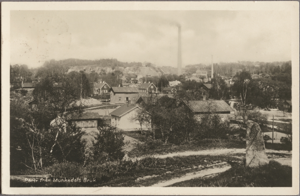 Parti av Munkedal med pappersfabriken i bakgrunden.