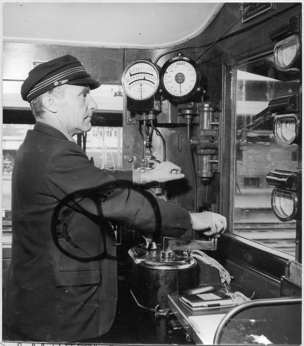Lokförare i förarhytten i Ellok. Statens Järnvägar, SJ Dk.