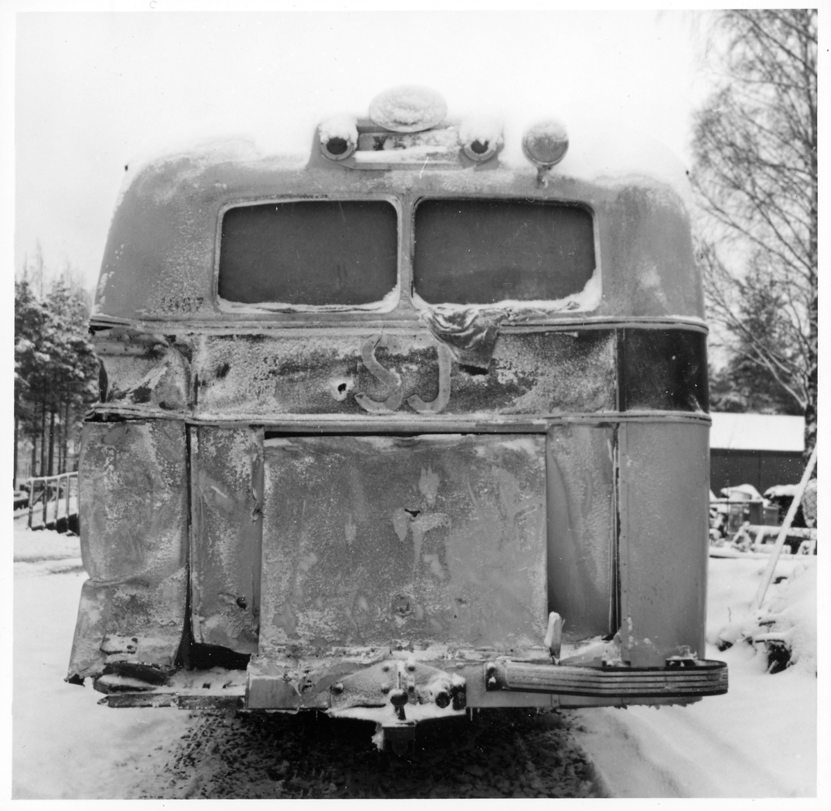 Kollisionsskadad buss. Statens Järnvägar, SJ buss 1887.