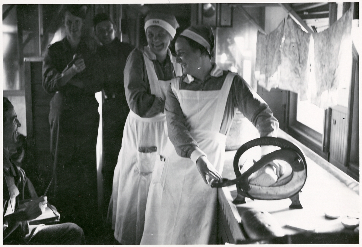Titel: Svenska lottakåren ombord svenskt sjukhuståg med tyska sårade soldater.