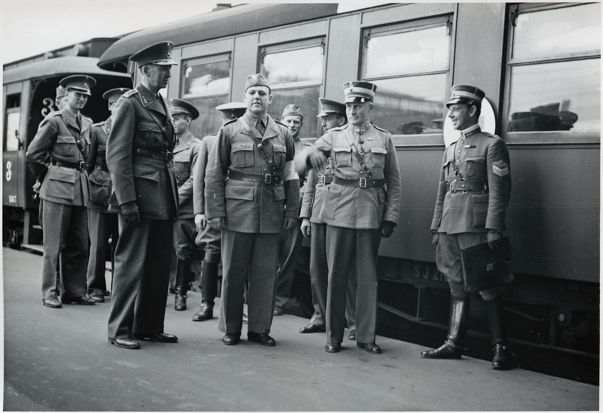 Sveriges Överbefälhavare, General Olof Thörnell samt Byråchefen vid Kungliga Järnvägsstyrelsen, Överstelöjtnant Henrik Wrede framför Statens Järnvägar, SJ Sjukhuståg Tpnr H39.
