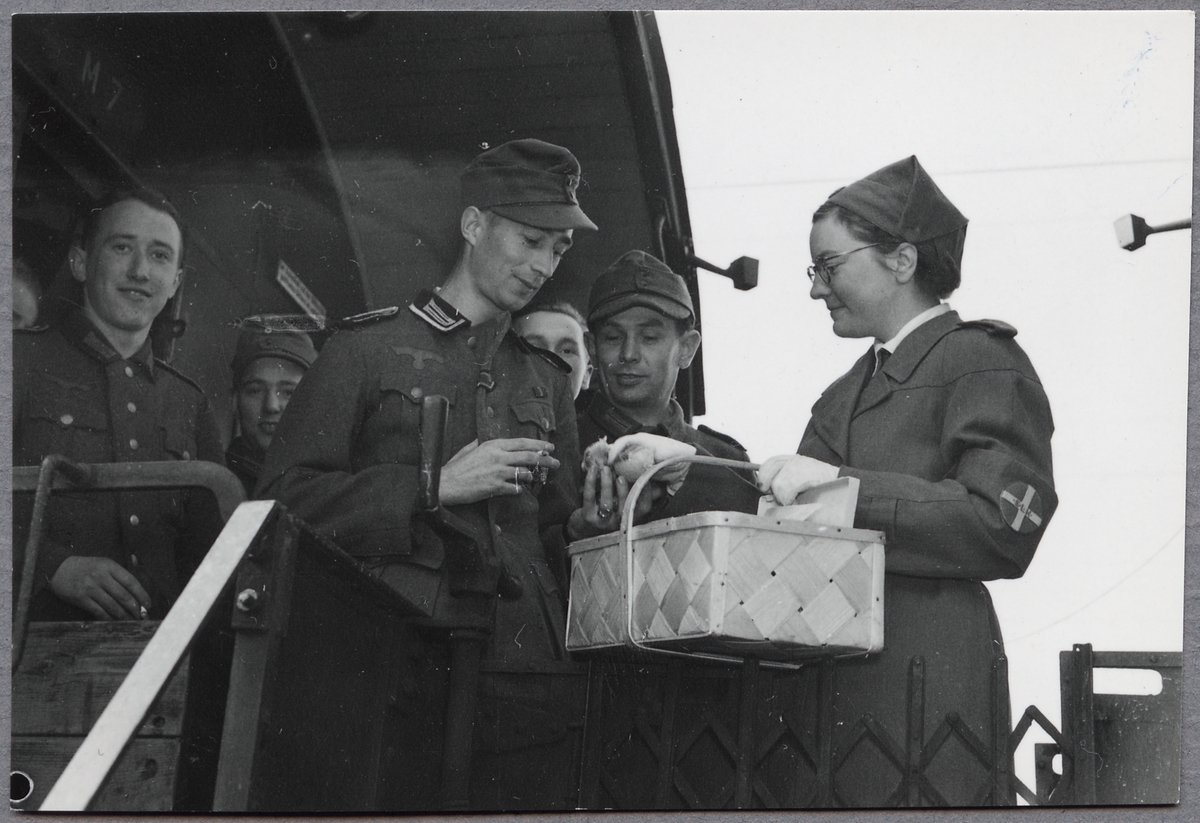 En medlem av Lottakåren besöker skadade tyska soldater i Hallsberg under Andra Världskriget.