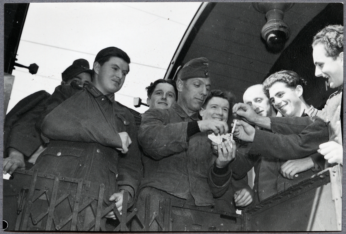 Skadade tyska soldater ombord på tyskt sjukvårdståg i Hallsberg under Andra Världskriget.