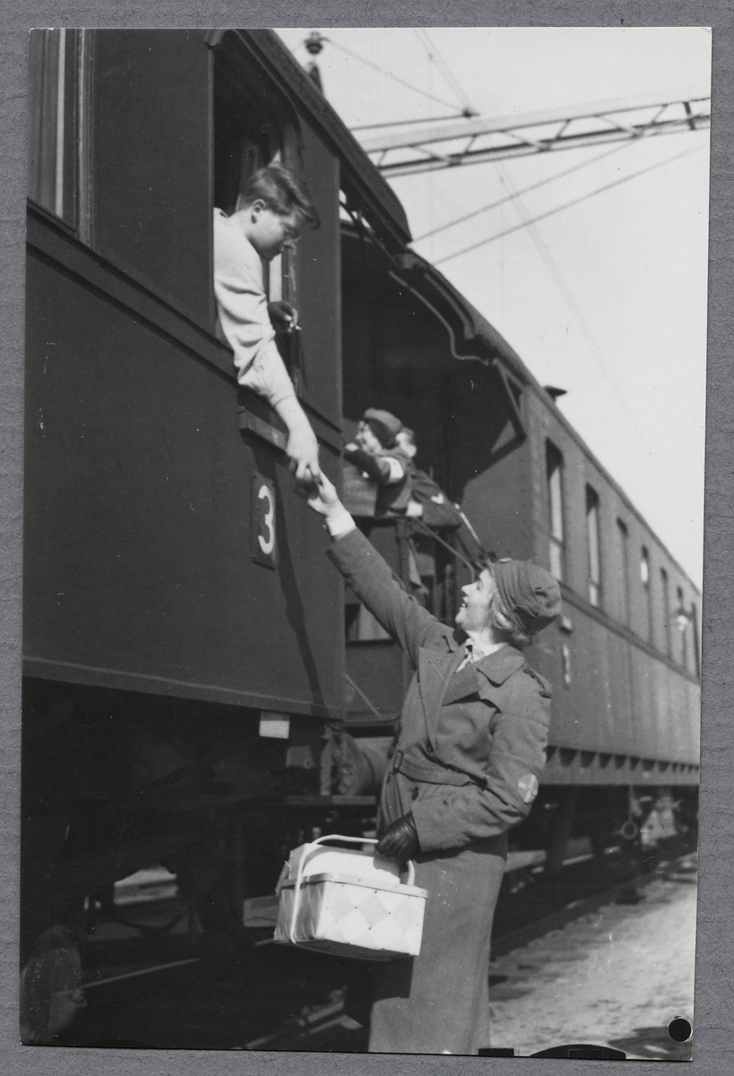 En medlem ur Lottakåren överräcker förnödenheter till skadad tysk soldat i Hallsberg under Andra Världskriget.