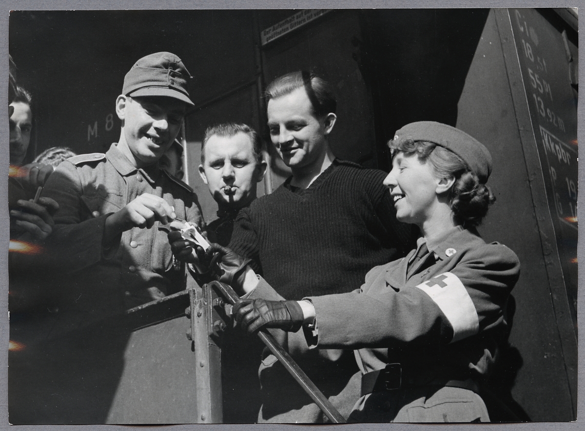Rödakorssyster överlämnar cigaretter till sårade tyska soldater ombord på ett tyskt sjukvårdståg i Hallsberg under Andra Världskriget.