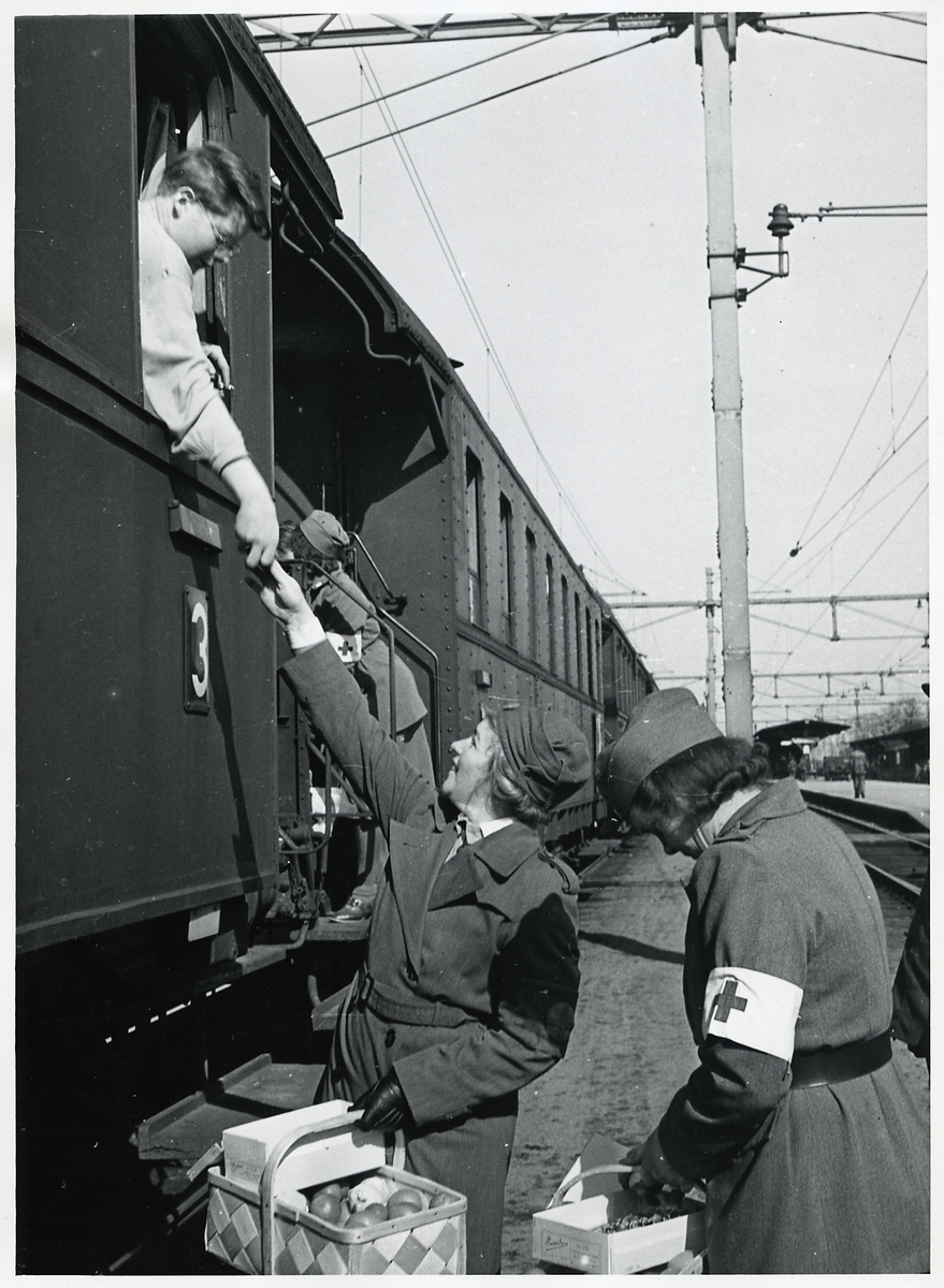 En rödakorssyster och en lotta överäcker förnödenheter till skadad tysk soldat ombord på ett tyskt sjukvårdståg i Hallsberg under Andra Världskriget.