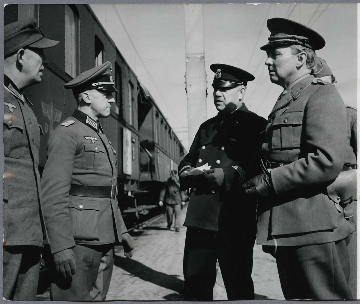 Överinspektör Linell samt svenska militärer i samtal med tyska militärer. Detta i samband med att ett tyskt sjukvårdståg passerar Hallsberg under Andra Världskriget.