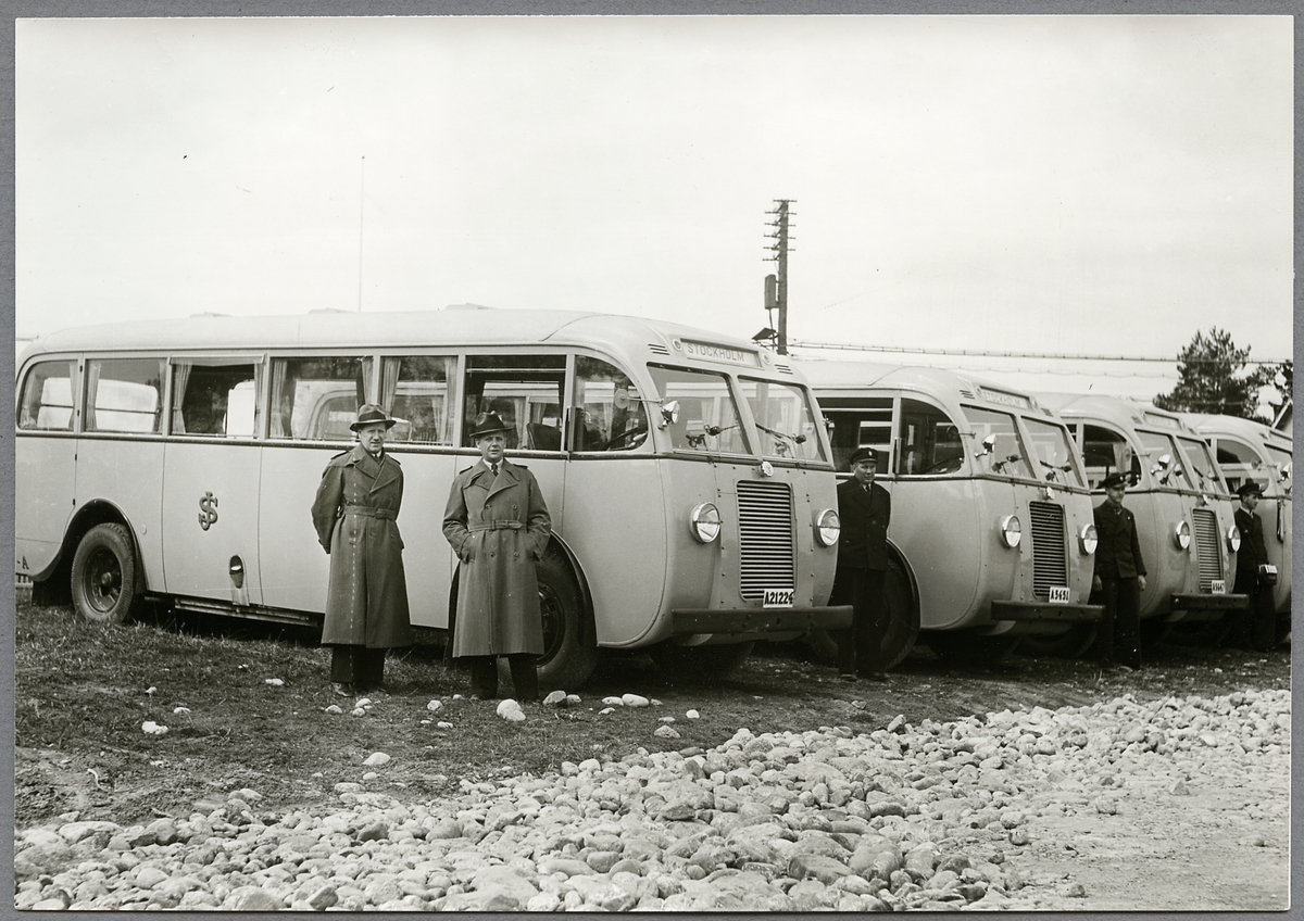 Statens Järnvägar, SJ bussar och personal står uppställda i Skavsta.