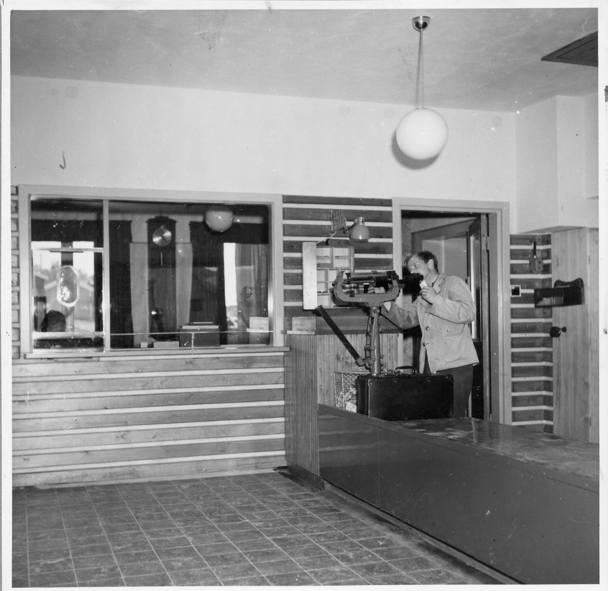 Vägning av resväska i väntsalen vid Funäsdalens busstation.