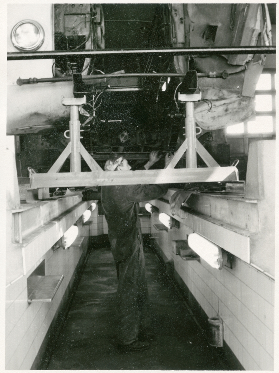 Fordonsmekaniker arbetar under en krockskadad buss.