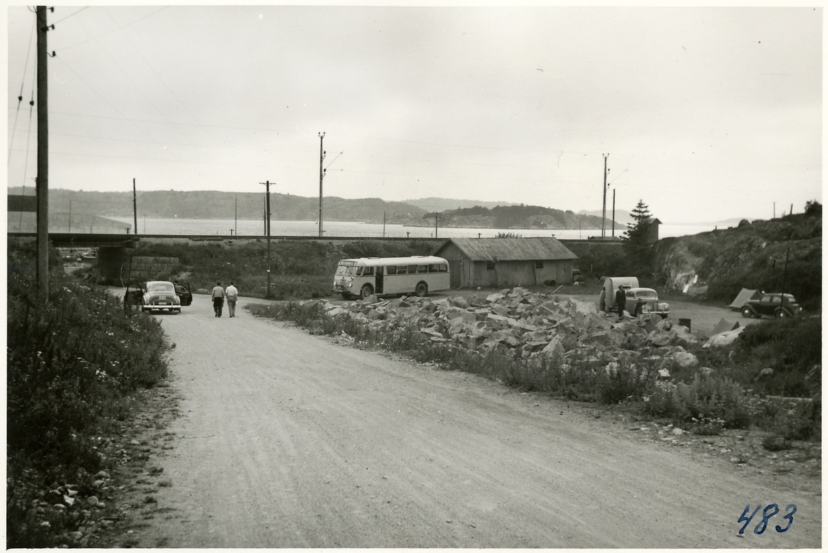 Statens Järnvägar, SJ buss och garage samt turister med husvagn och tält.