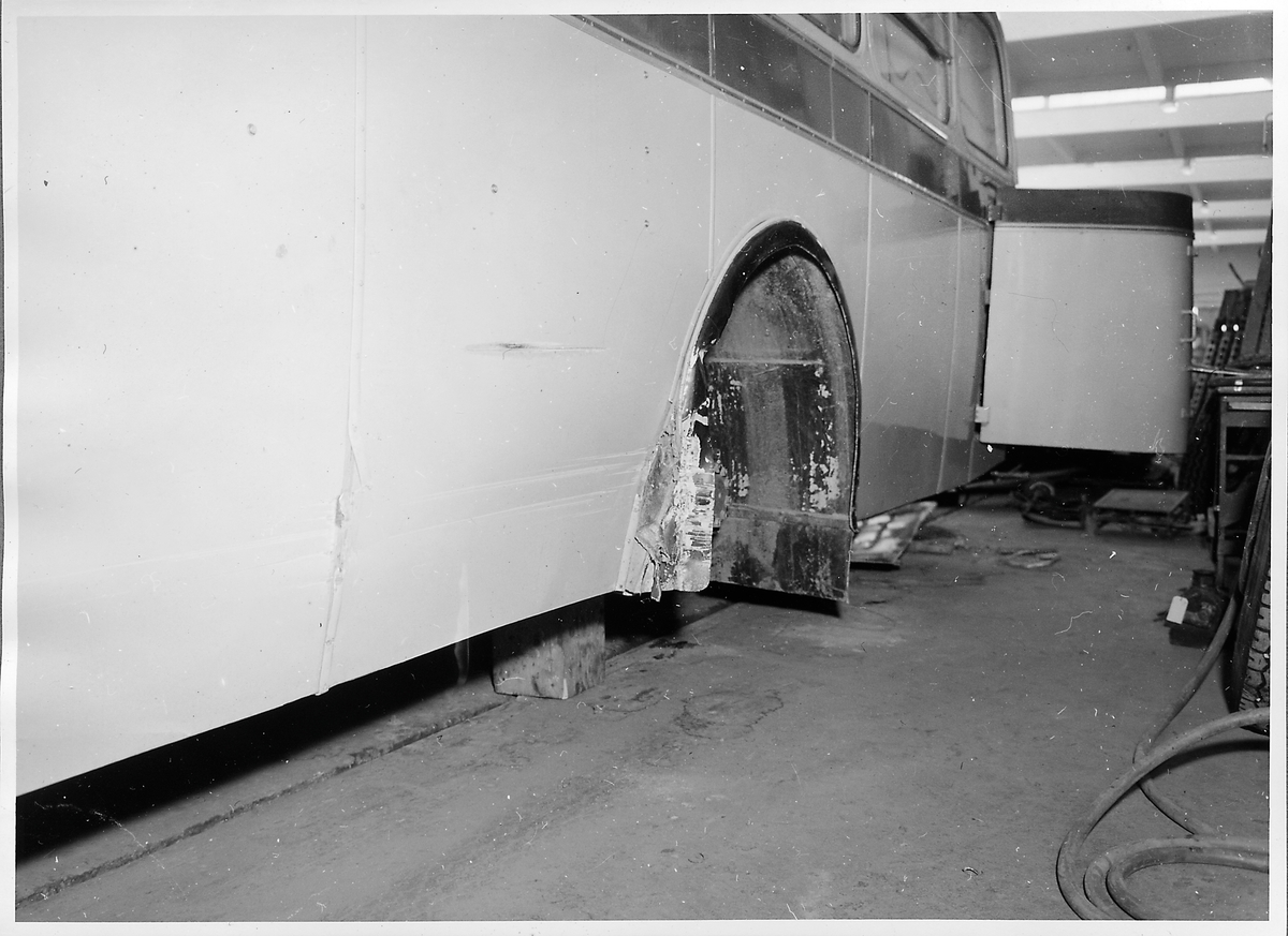 Kollisionskadad buss, Statens Järnvägars, SJ buss 2085 på verkstad.