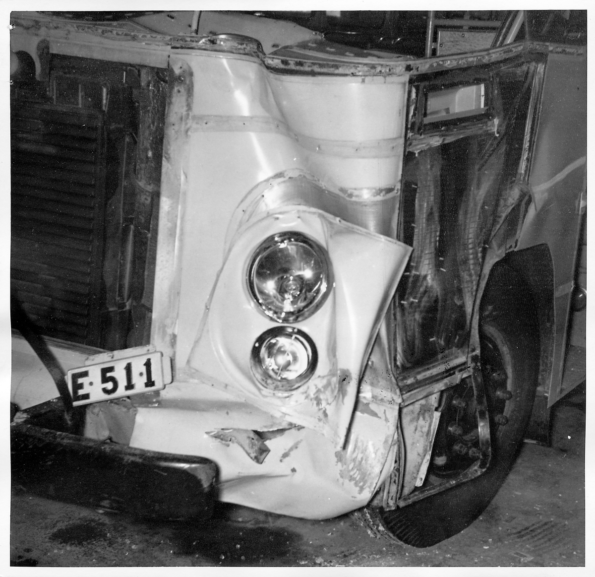Detaljbild på kollisionskadad buss, Statens Järnvägars, SJ buss 2128.
