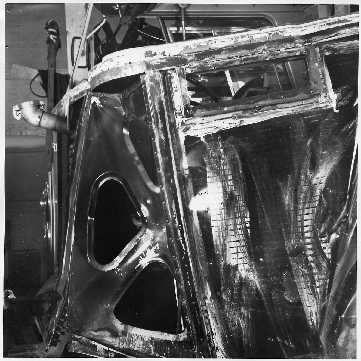 Detaljbild på kollisionskadad buss, Statens Järnvägars, SJ buss 2128.