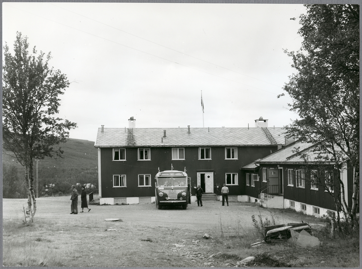 Statens Järnvägar, SJ buss 1877 utanför turistanläggning på Nordkalotten.