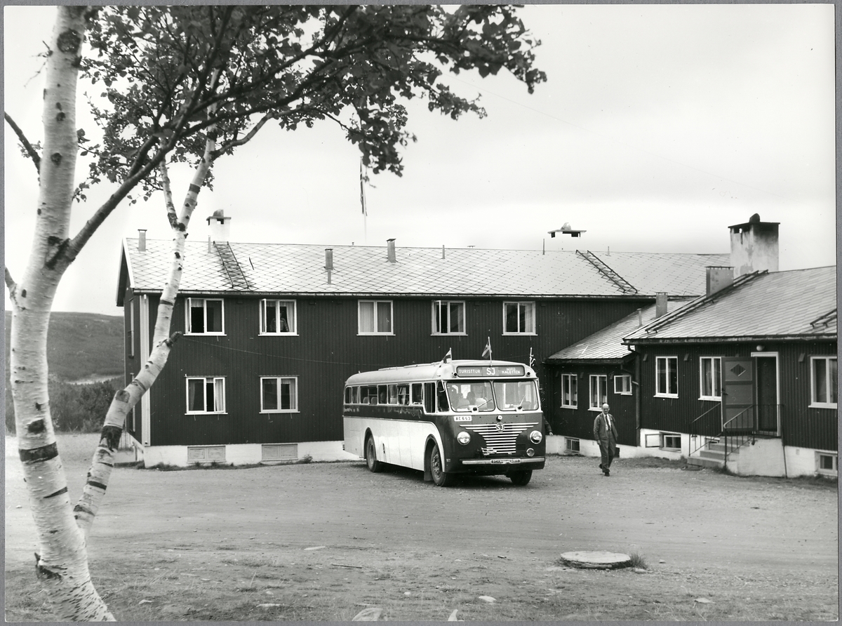 Statens Järnvägar, SJ buss 1877 utanför turistanläggning på Nordkalotten.
