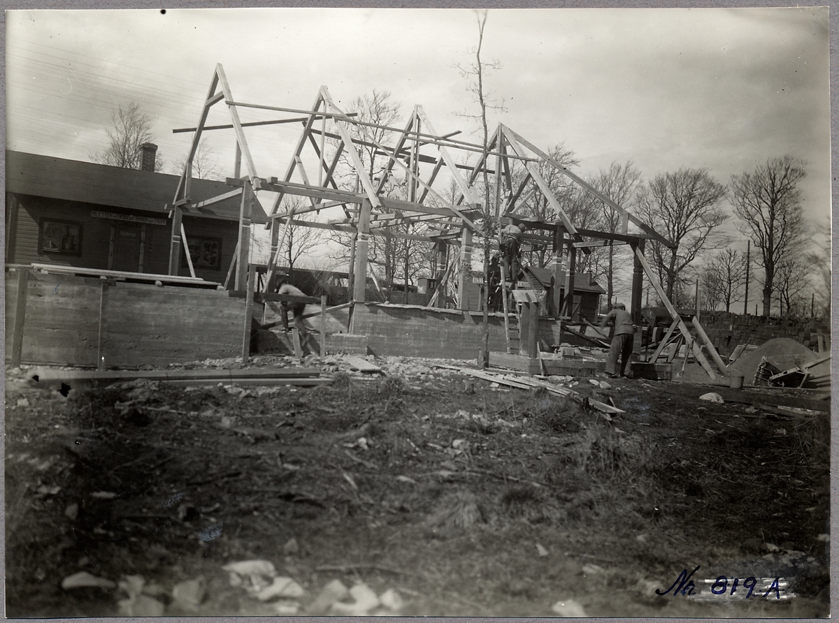 Titel: Sjöholmens stationshus under uppbyggnad.
