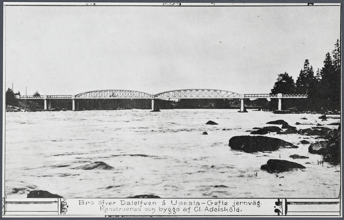 Uppsala - Gävle Järnväg, UGJ. Järnvägsbro över Dalälven konstruerad av Claes Adelsköld. Bron är belägen på linjen mellan Tierp och Gävle.