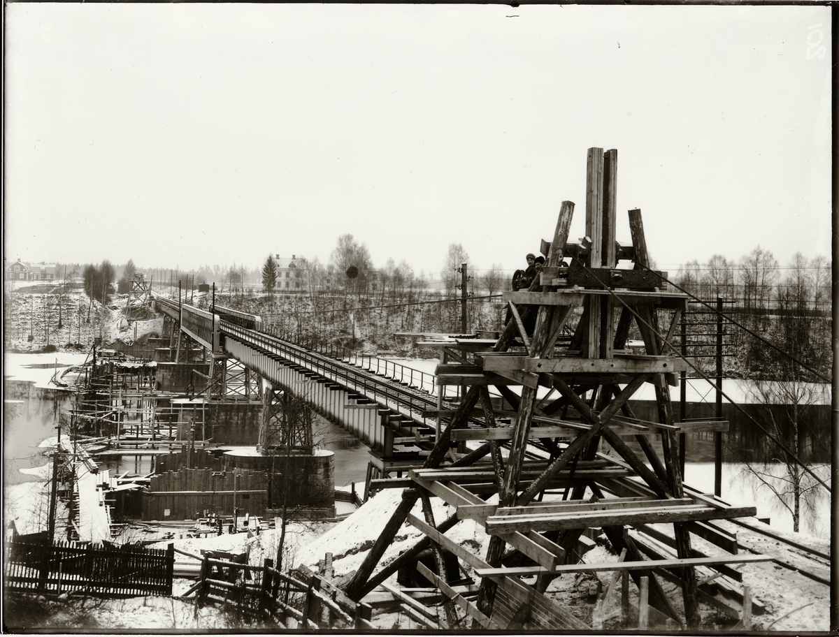 Bro över Dalälven vid Krylbo under byggnation. Öppnades i september 1875.
