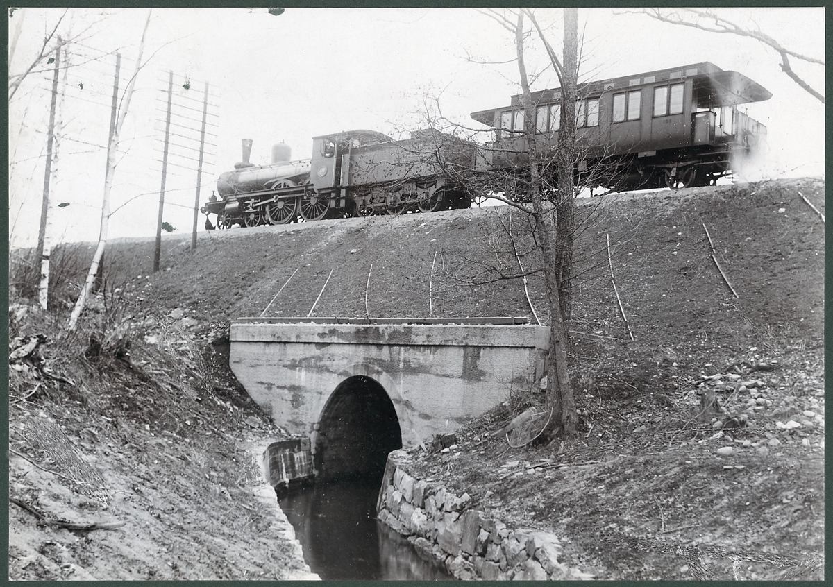 Kulvert över Bränningeån. statens Järnvägar, SJ Cc 618. Tillverkad 1900 Nohab, Skrotad i Vislanda 1956. Vagnen är SJ inspektionsvagn före detta SJ C1 898. På linjen mellan Järna och Södertälje Syd undre.