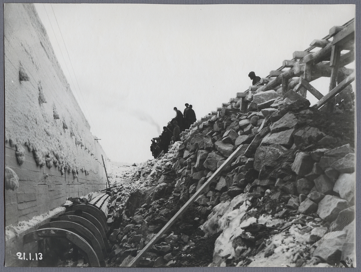Porjus kraftverk under byggnation vid Stora Lule älv. Stenfyllning bakom dammkärnan.