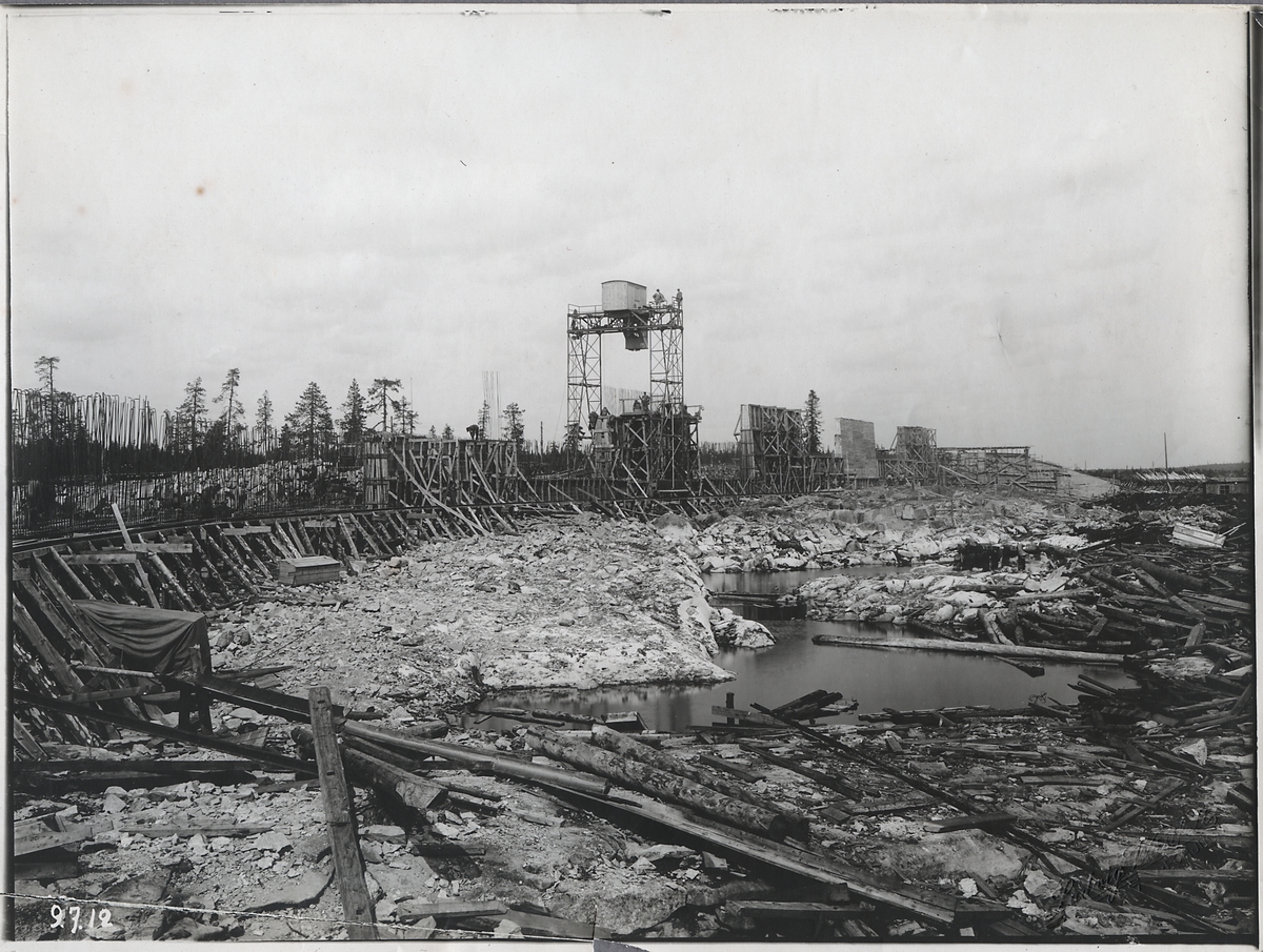 Porjus kraftverk under byggnation vid Stora Lule älv. Arbetslag i arbete med dammkärnan.