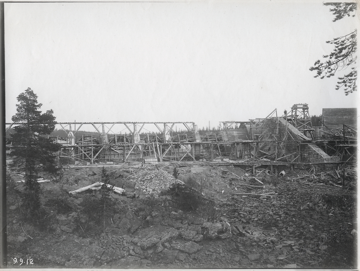 Porjus kraftverk under byggnation. Panorama över lilla skibordet.