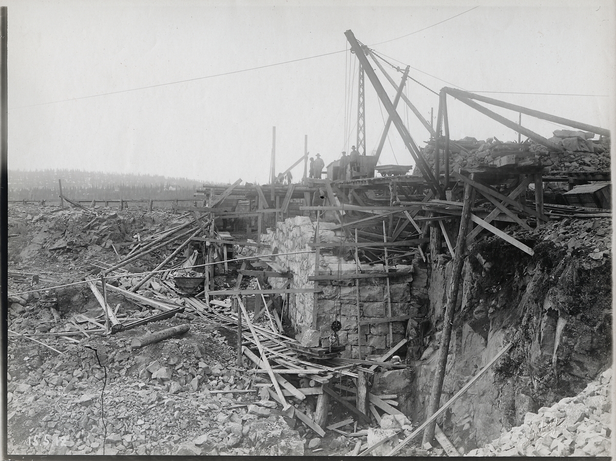 Porjus kraftverk under byggnation. En av vingmurarna för lilla skibordet.