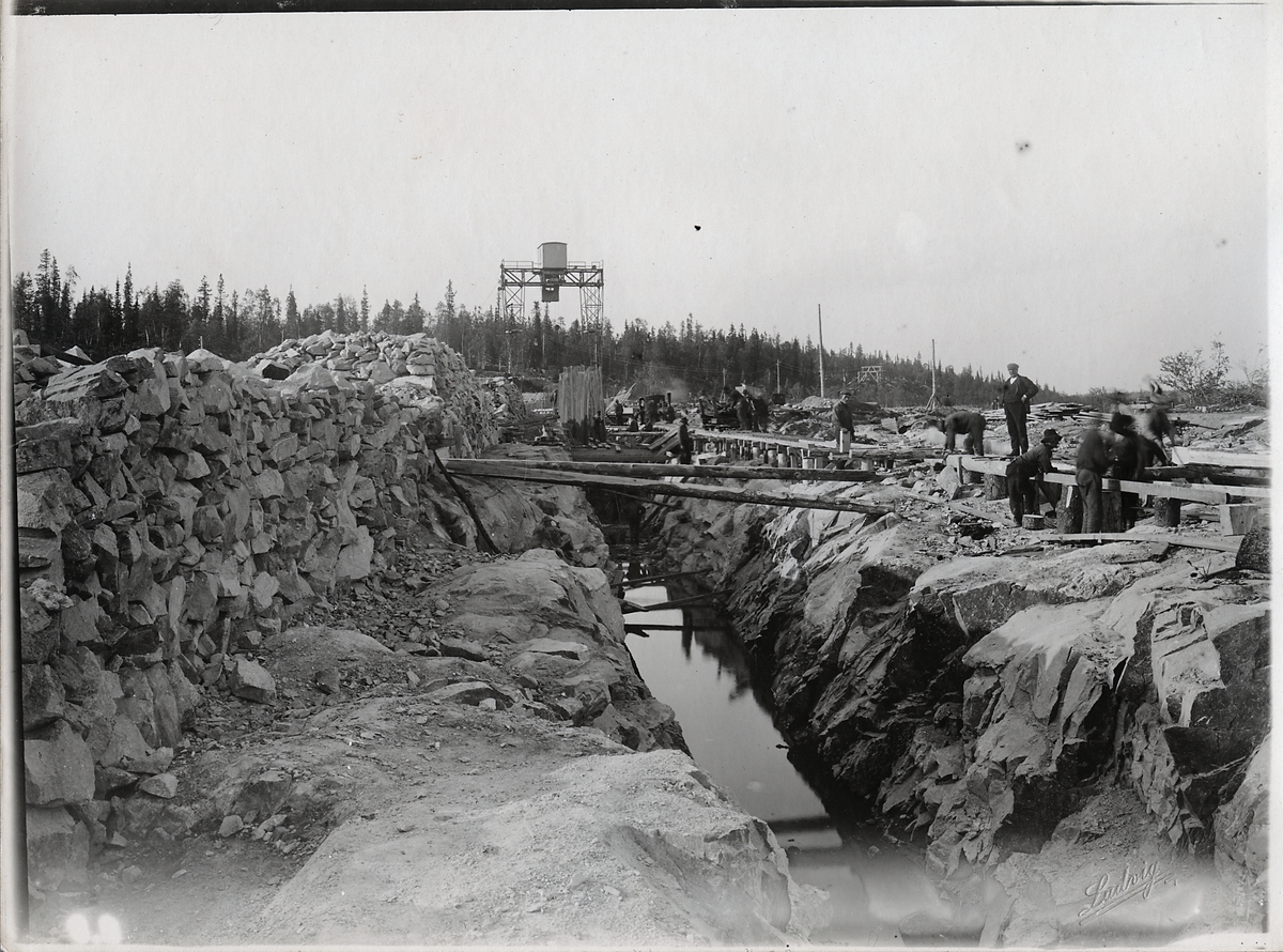 Porjus kraftverk under byggnation. Arbetslag i arbete med dammen på västra stranden.