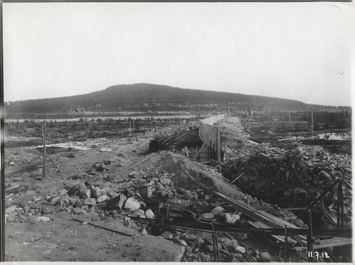 Porjus kraftverk under byggnation. Dammkärnan på västra stranden.