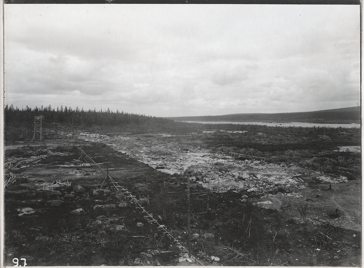 Porjus kraftverk under byggnation. Vy över dammsträckningen på den västra stranden.
