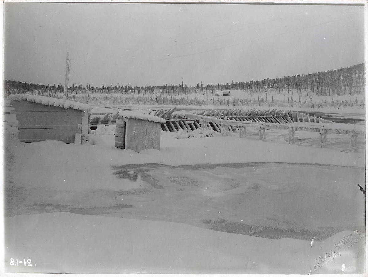 Porjus kraftverk under byggnation vid Stora Lule älv. Fångdammen på den västra stranden.