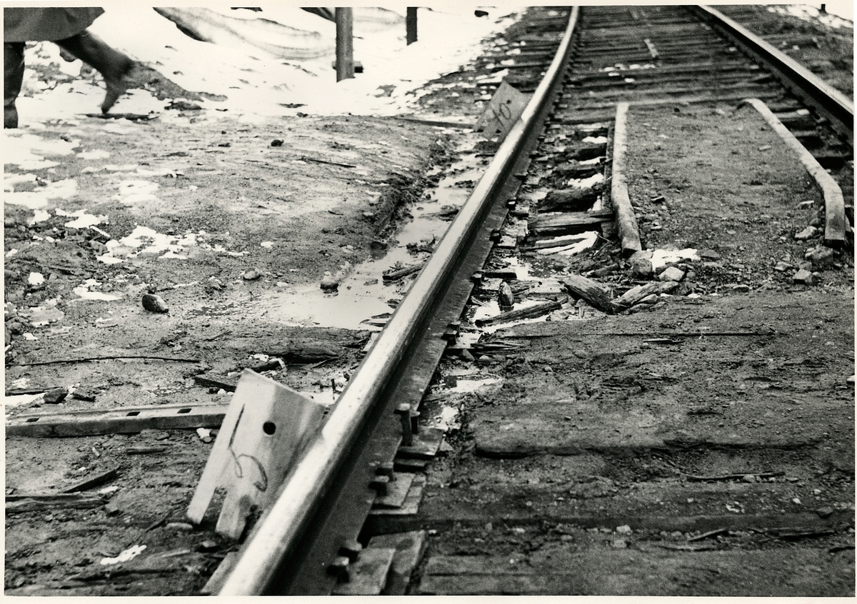 Titel: Del av bangården efter olyckan 1956-03-29 då tåg 93, 'Nordpilen, spårade ur vid Granbo station.