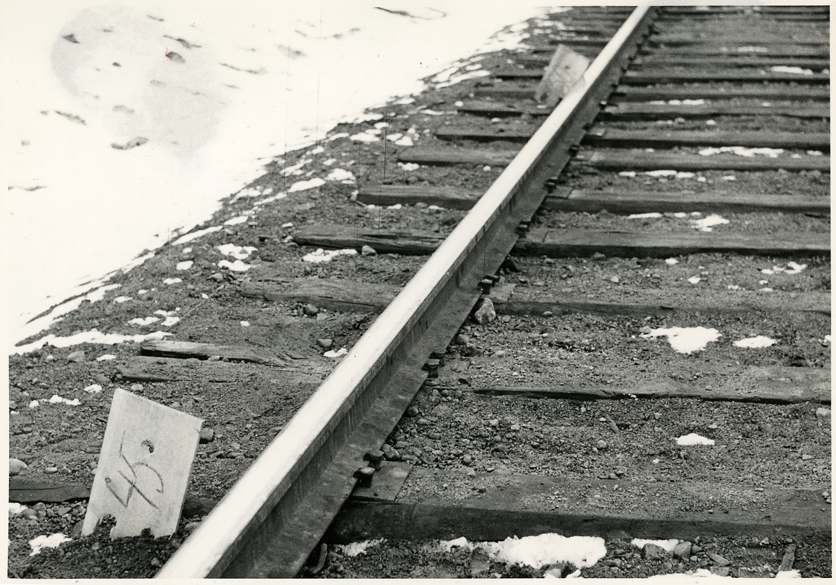 Titel: Del av bangården efter olyckan 1956-03-29 då tåg 93, 'Nordpilen, spårade ur vid Granbo station.