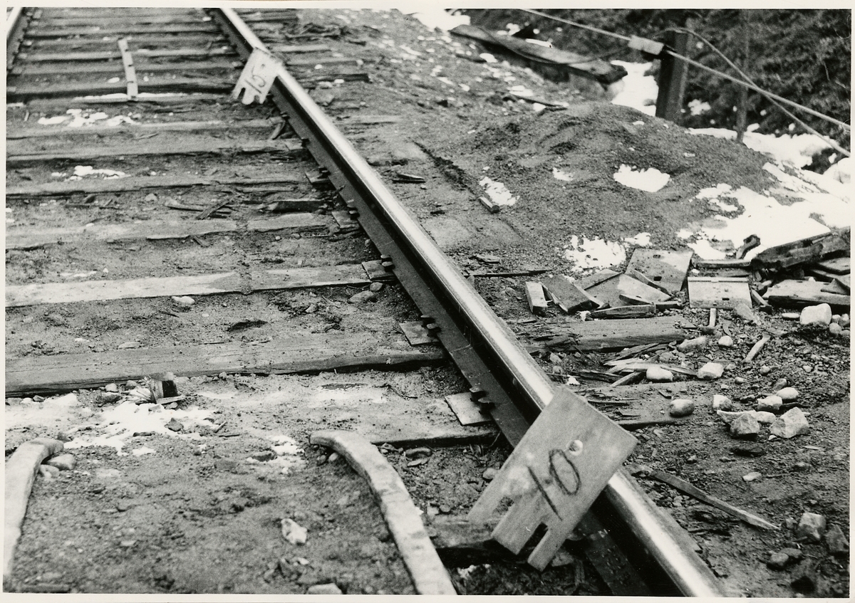 Titel: Del av bangården efter olyckan 1956-03-29 då tåg 93, 'Nordpilen, spårade ur vid Granbo station.