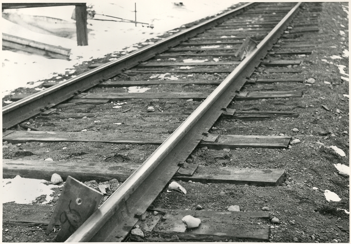 Titel: Del av bangården efter olyckan 1956-03-29 då tåg 93, 'Nordpilen, spårade ur vid Granbo station.