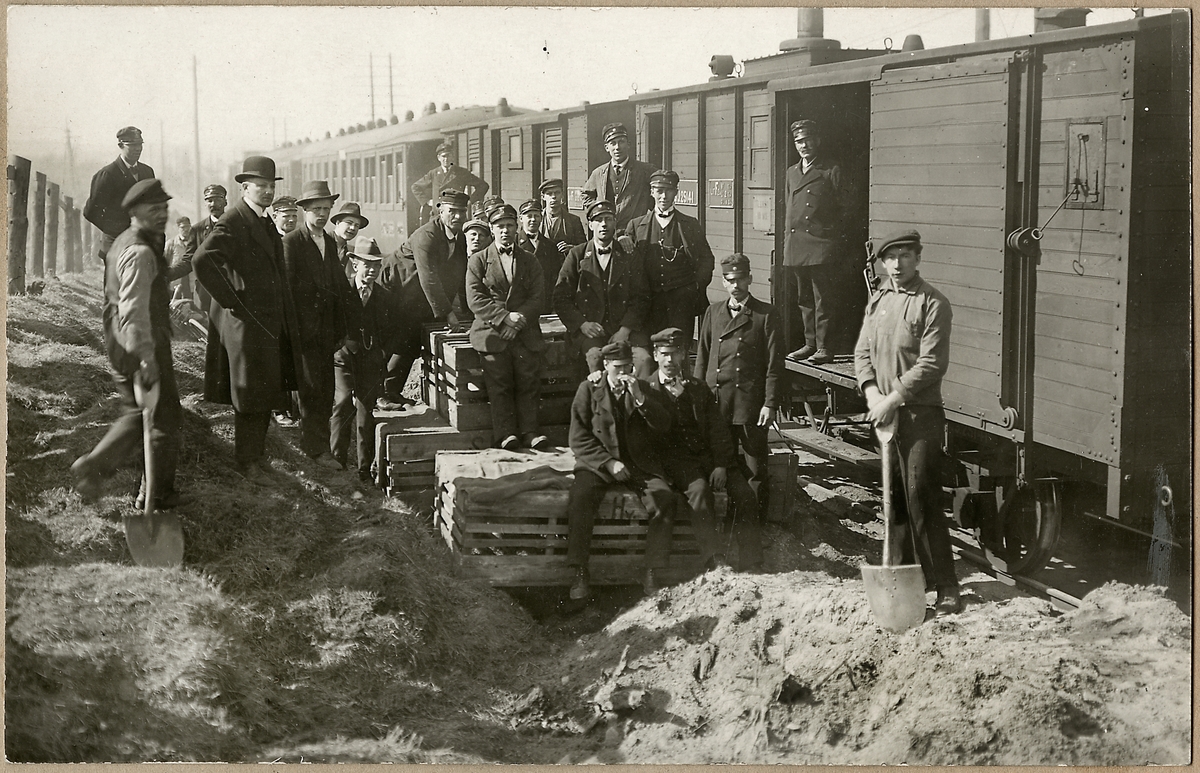 Personal vid tåg, bilden tagen i samband bygget av en ny järnvägsbro efter raset vid Sidsjöbäcken, Sundsvall. Närmaste personvagnar är från höger Statens Järnvägar, SJ F2a 25141, F1, BCo3 och eventuellt C3deg.