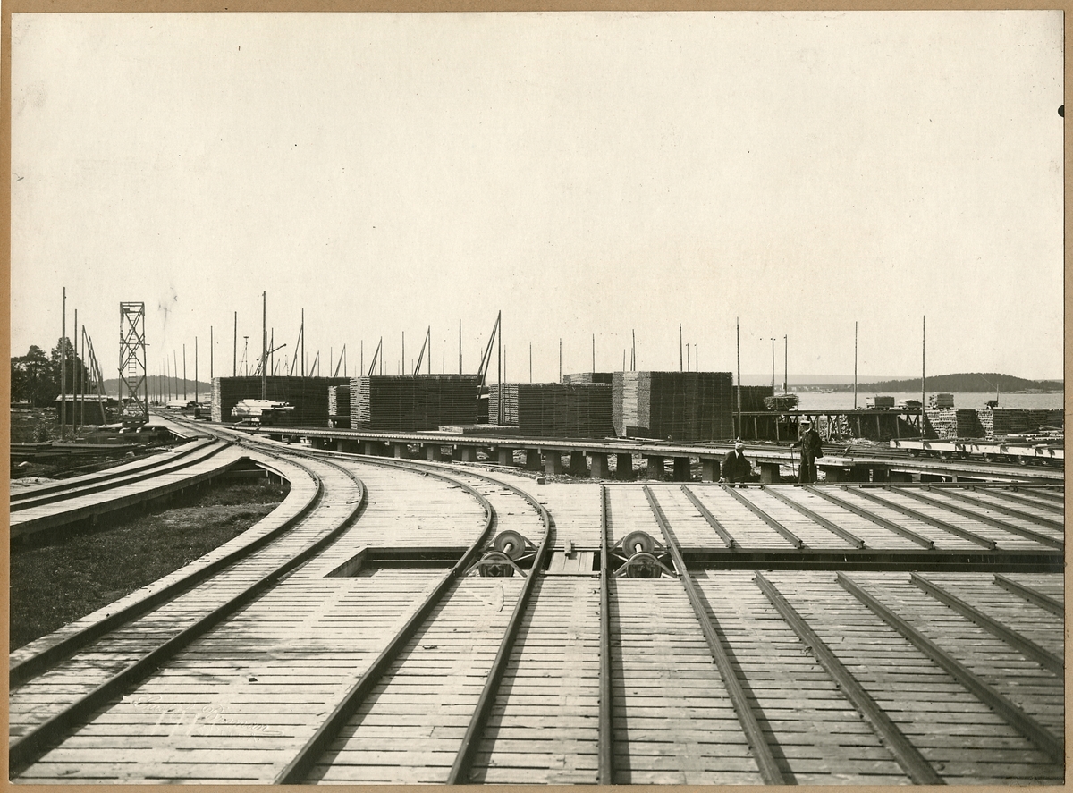 Brädgården sedd från sorteringsbryggan, Statens Järnvägars slipersfabrik i Piteå.