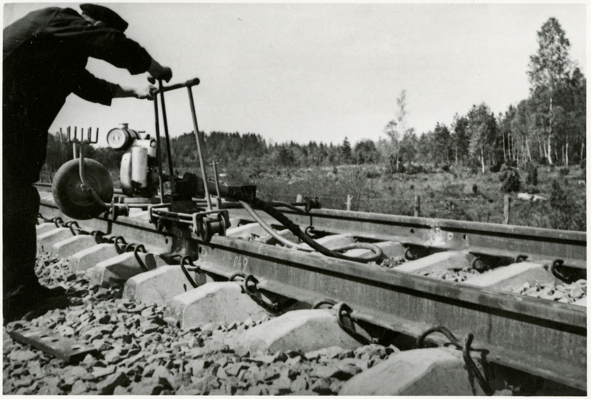 Thermitsvetsning av skarvar på betongslipers, på sträckan mellan Nässjö-Sävsjö 1953.