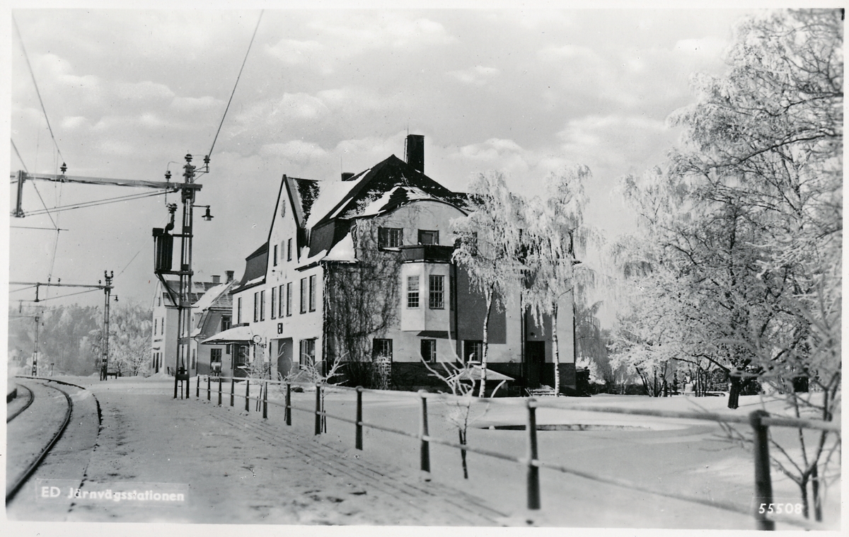 Titel: Stationen anlades 1879. Pingstaftonens förmiddag 1910 brann stationen ned till grunden tillsammans med Hotell Drott, Lilla Hotellet och Järnvägshotellet. Stationsbyggnaden var från sitt ursprungliga skick påbyggd med en våning, samt en farstu norrut. 1912 stod det nya stationshuset färdigt. Intill dess användes en reservstation i en fastighet som tillhörde DJ och som låg vid spårområdet på södra sidan. DJ , Dalslands Järnväg