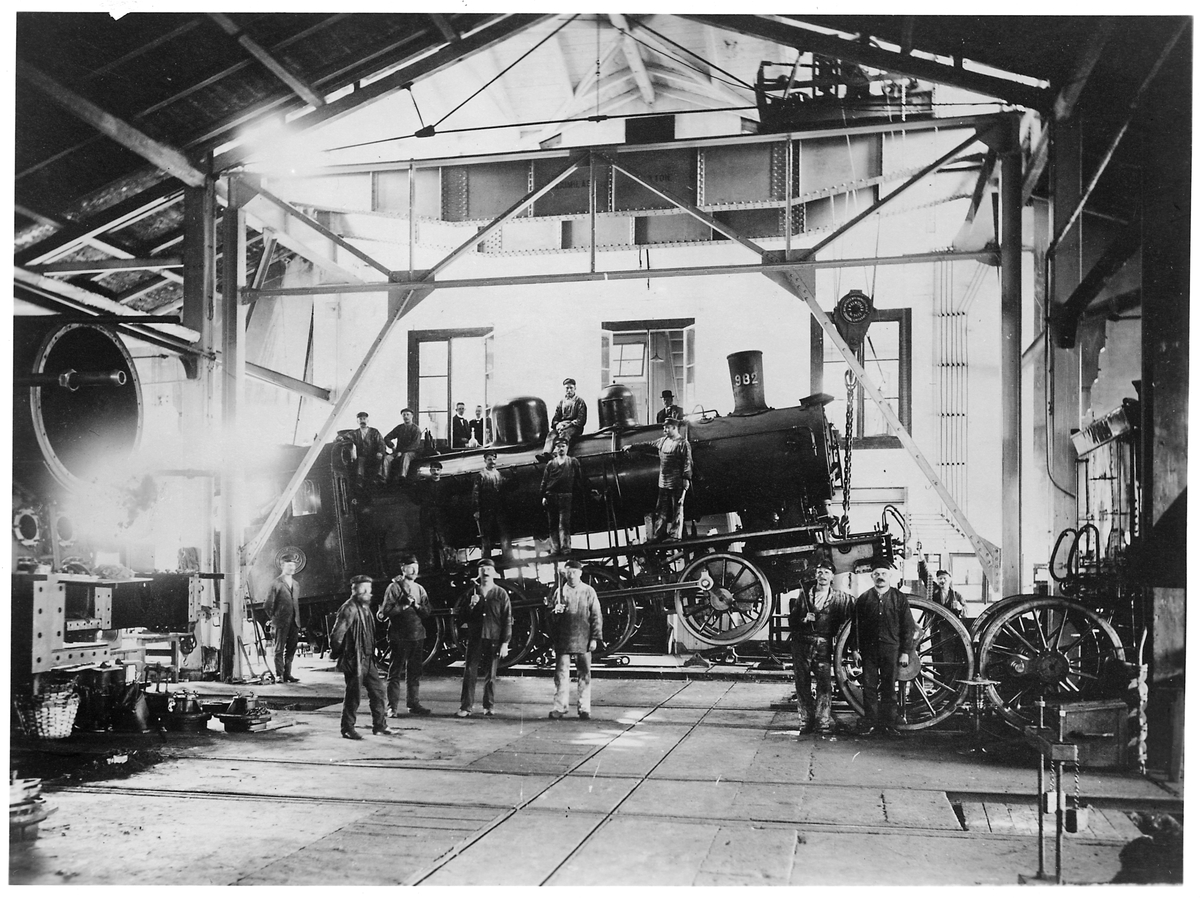 Statens Järnvägar, SJ E 982 inne för reparation. Loket upplyft i framändan. Personalen poserar framför och på loket.