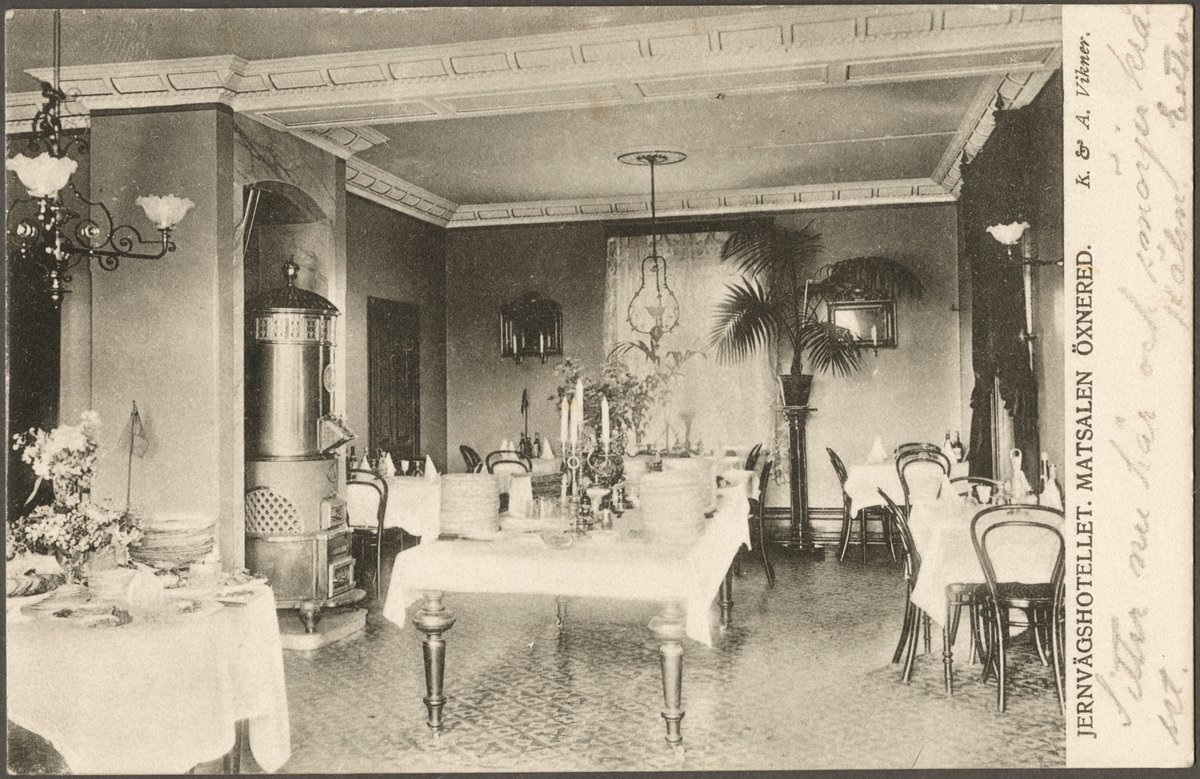 Interiör från matsalen i Öxnereds järnvägshotell.