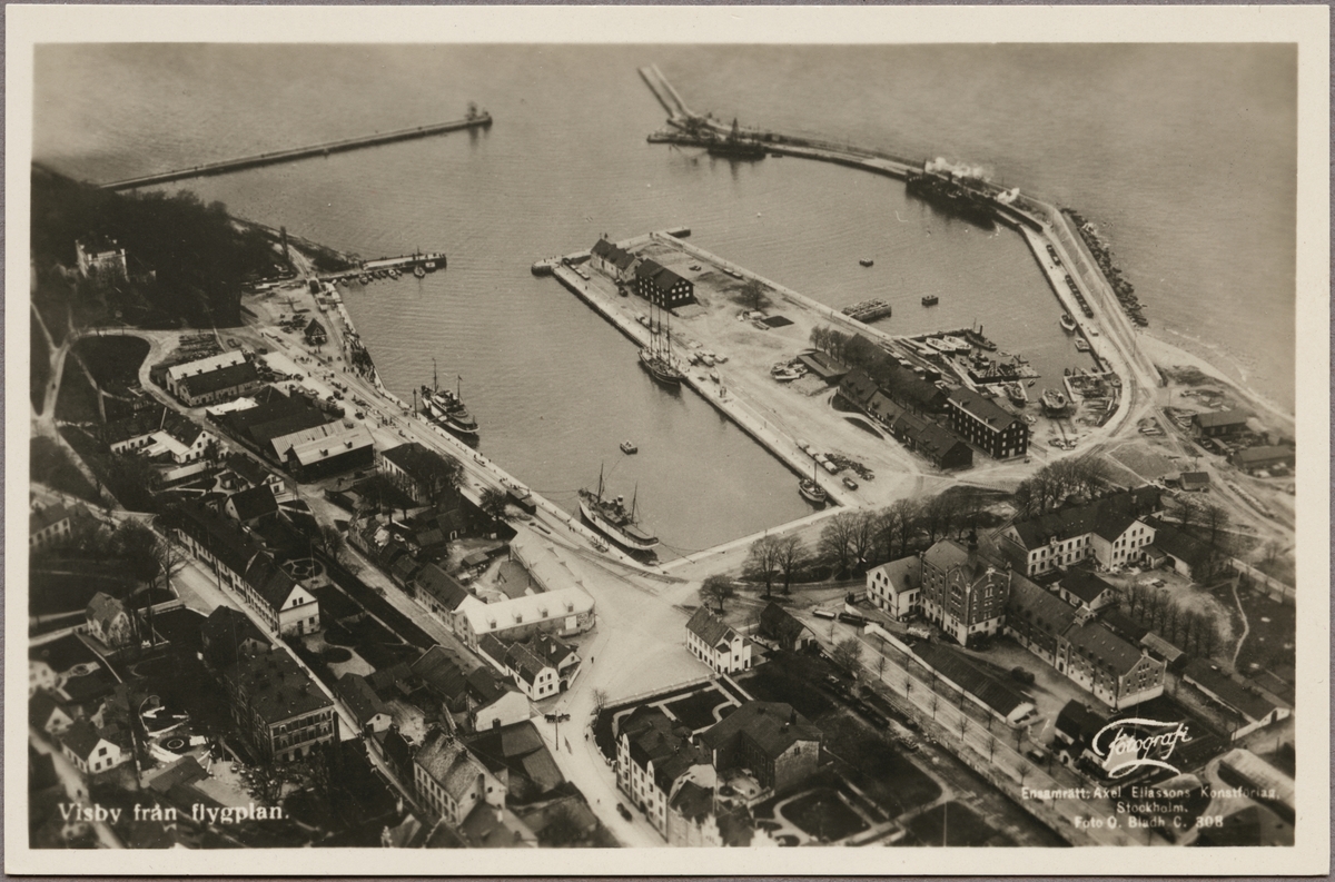 Flygfoto på hamnområde i Visby stad vid Östersjön.