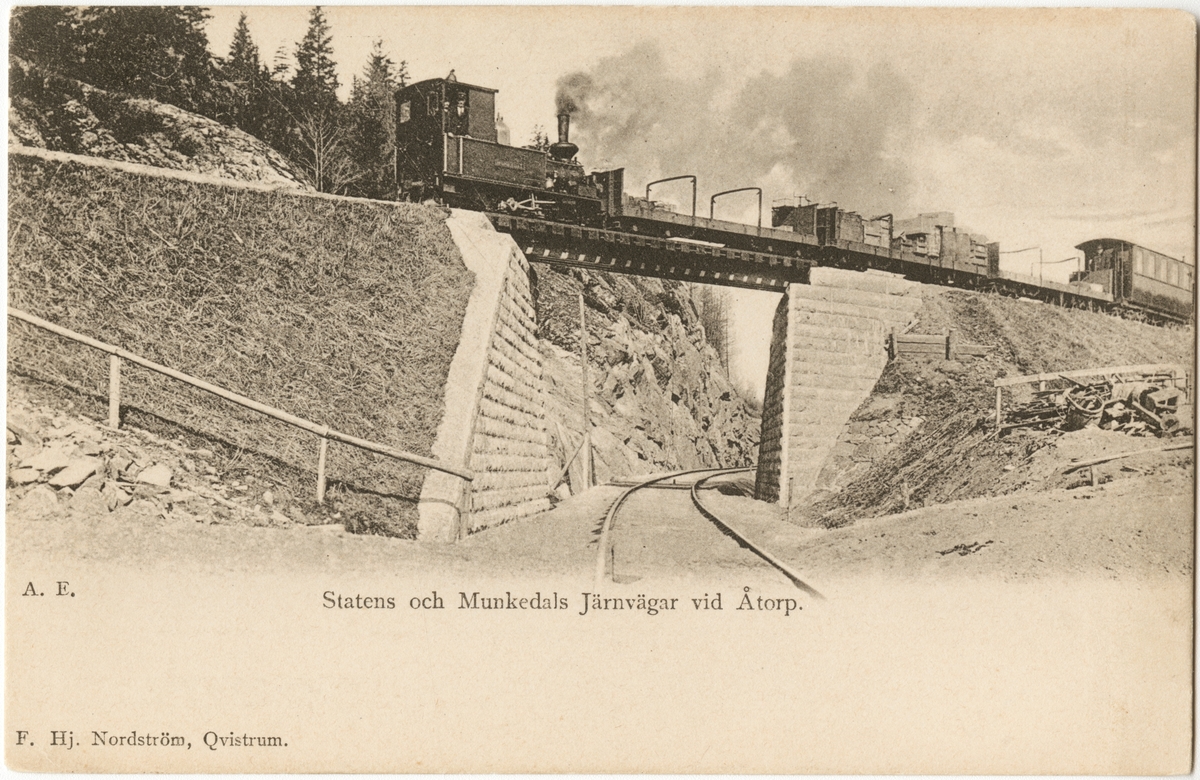 Viadukt på linjen mellan Munkedal och Uddevalla vid Åtorp, strax söder om Munkedal. Statens Järnvägar och Munkedals Järnväg korsar varandra.