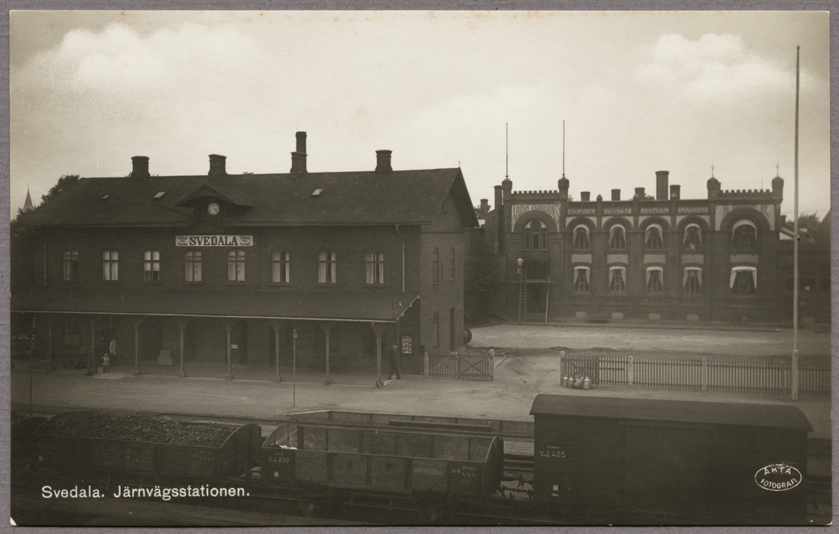Vy på Svedala stationsområde med Abjörn Andersons mekaniska verkstad i bakgrunden. Godsvagnarna i nederkant är från vänster till höger Ystads Järnväg, YJ L 1176, YJ L 930 och YJ G 405.