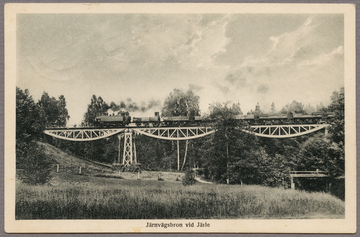 Järnvägsbro över Järleån mellan Lilla Mon och Järle med trafikerande godståg i bild.