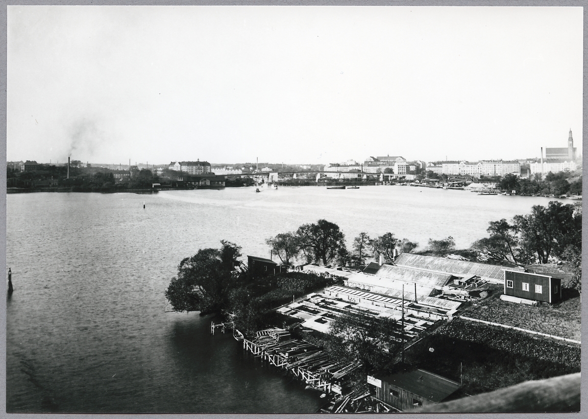 Vy från Årstabron över Trädgårdsanläggningen på Årsta Holmar.