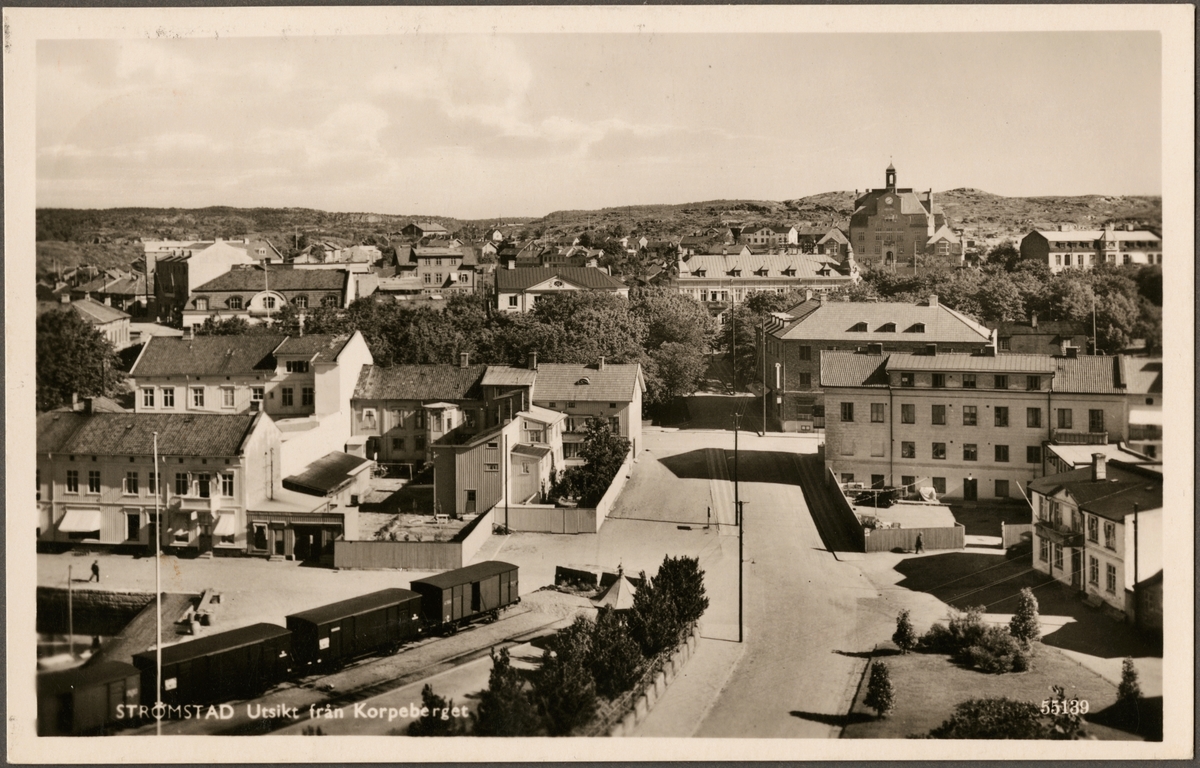 Vy på stad med del av bangård och med stadshuset i bakgrunden.