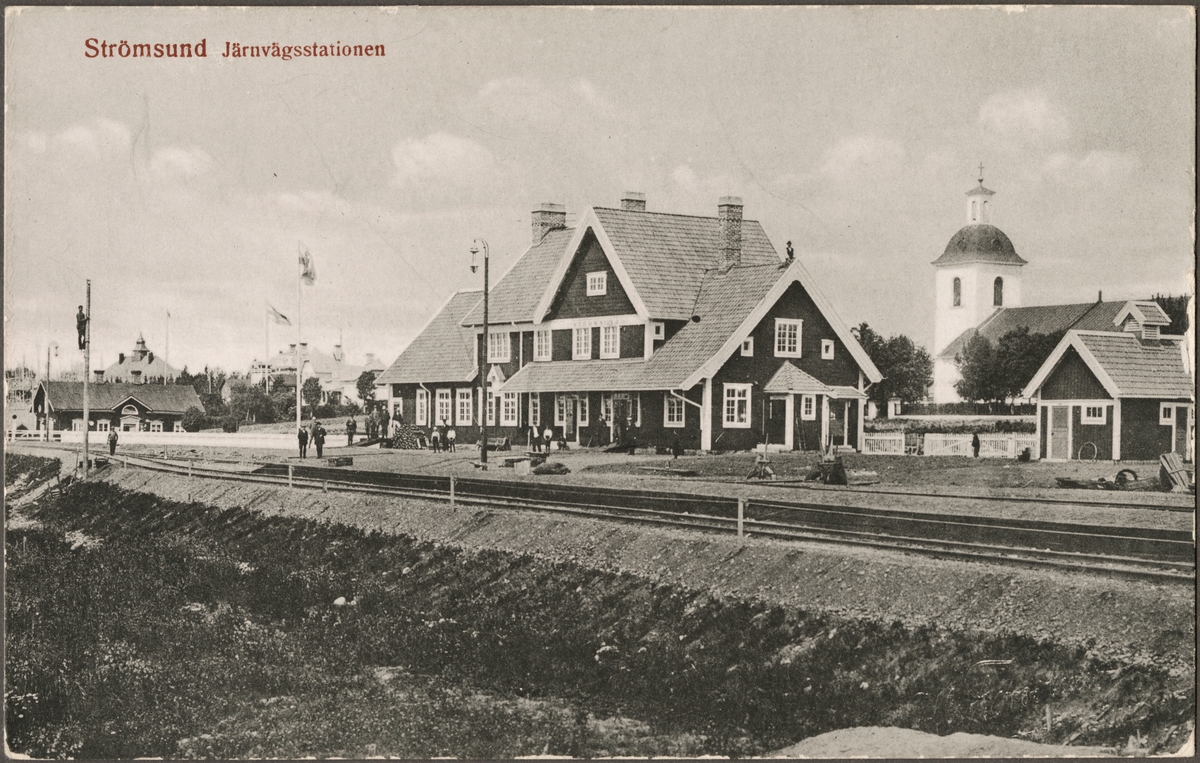 Spårsida av station med resande och kyrka i bakgrunden.