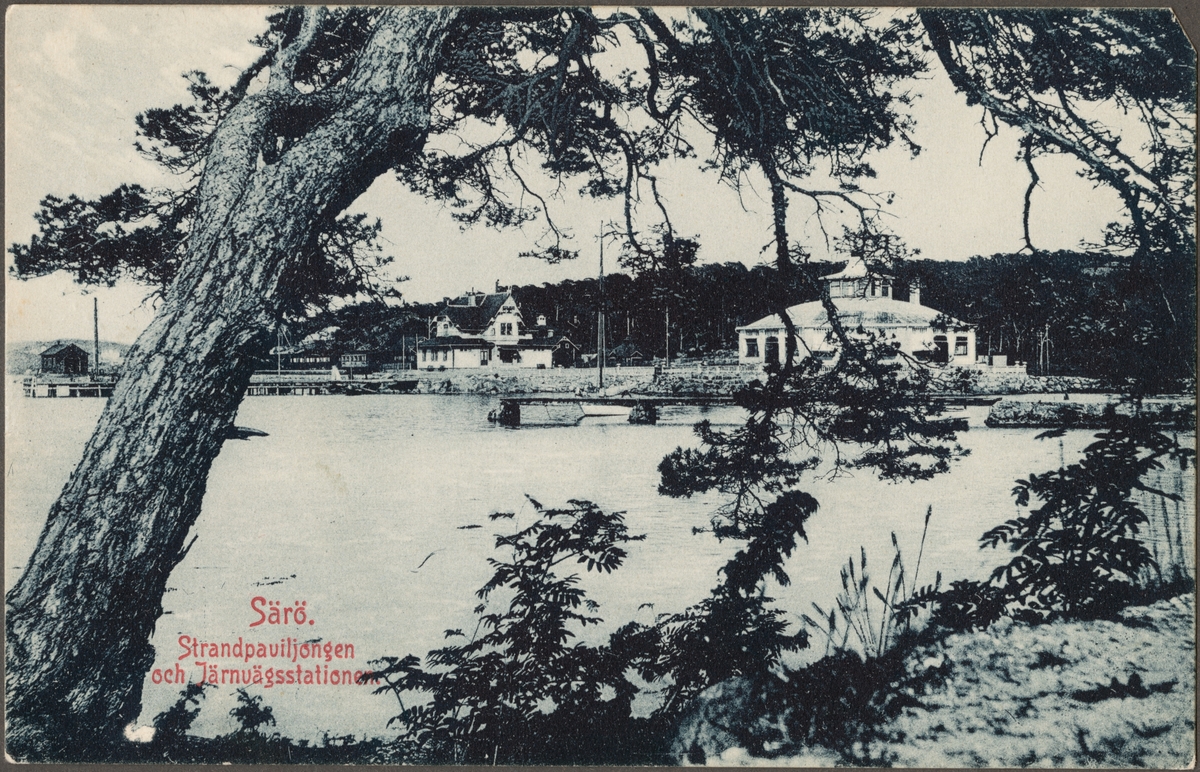 Vy på bebyggelse med småbåtshamn och järnvägsstation vid Skörvallaviken.